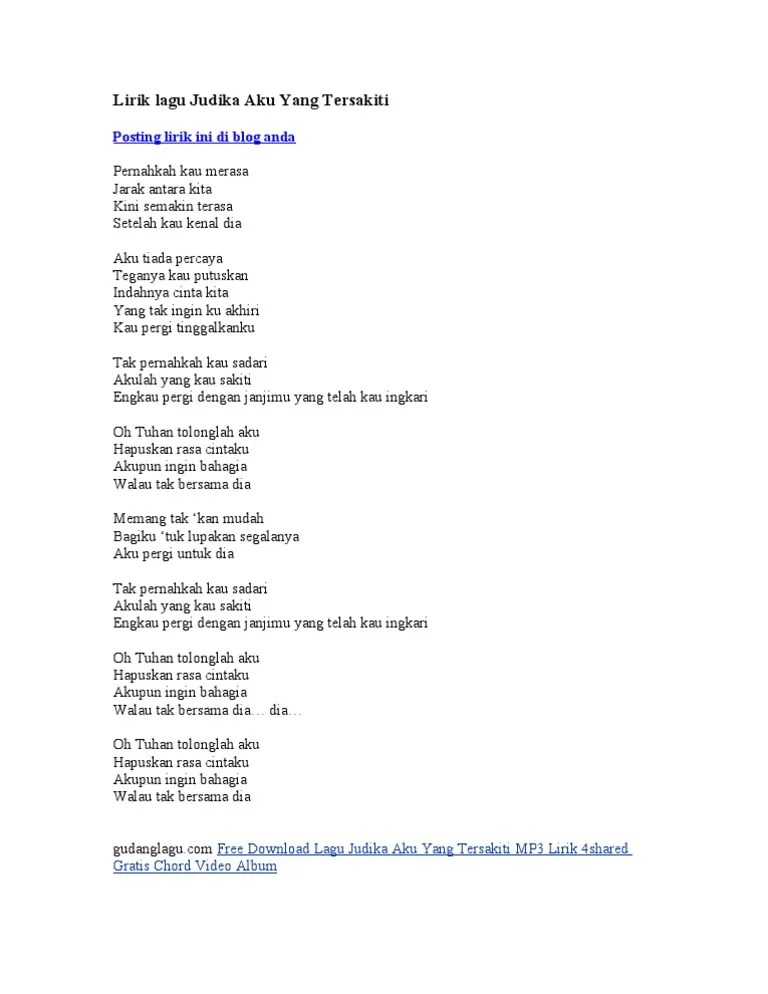 Oh tuhan tolonglah aku, hapuskan rasa . Engkau pergi dengan janjimu yang telah kau ingkari. Lagu ini dirilis pada tahun 2010 lalu. Tak pernahkah kau sadari akulah yang kau sakiti? Pernahkah kau bertanya seperti apa bentuk air tanpa wadah? Imut lucu walau tak terlalu tinggi. Oh tuhan tolonglah aku, hapuskan rasa . Rambut warna warni bagai gulali. Prechorus pernahkah kau bertanya seperti apa bentuk air tanpa . Engkau pergi dengan janjimu yang telah kau ingkari. Atau kukumu yang baru kau warnai? C g am pernahkah kau merasa Tak pernahkah kau sadari akulah yang kau sakiti?